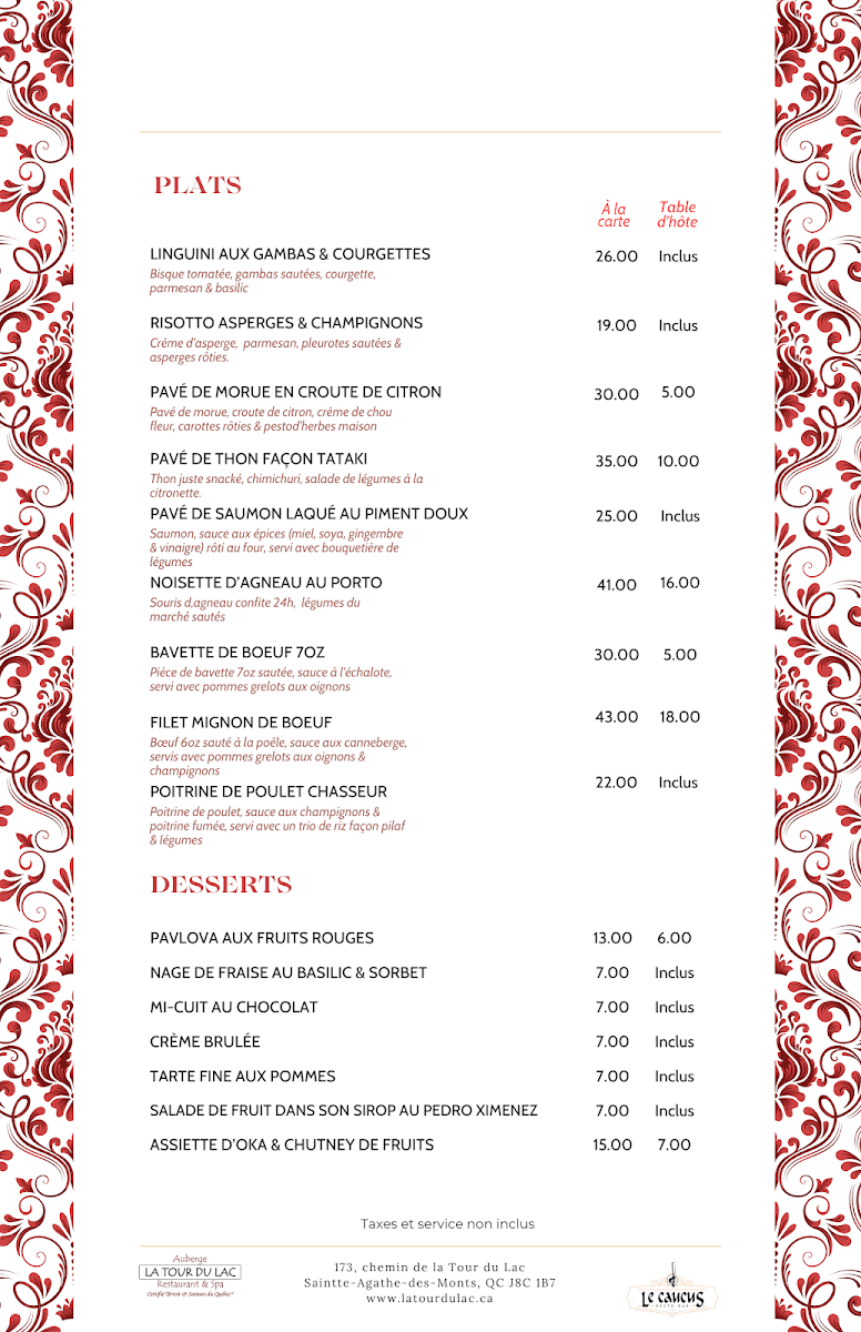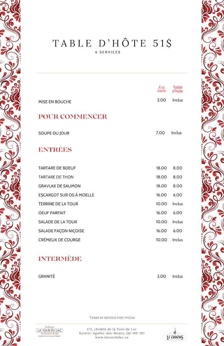 Welcome to Restaurant La Tour du Lac, a hidden gem nestled in the heart of Ste-Agathe-des-Monts, Quebec. Set within a charming century-old house, this restaurant offers an elegant blend of history and culinary delight. The restaurant is renowned for its exquisite French cuisine, highlighted by a thoughtfully curated Table d’hôte that impresses with four delicious courses and delightful palate cleansers. Each dish showcases the skill of the chefs, ensuring every bite is a celebration of flavor.
